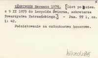 ZÄHRINGER Hermann 1876 [List po niem. z 9 II 1875 do Leopolda ¦wierza, sekretarza Towarzystwa Tatrzańskiego.]