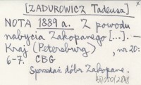 NOTA [ZADUROWICZ Tadeusz] 1889 a Z powodu nabycia Zakopanego [...].