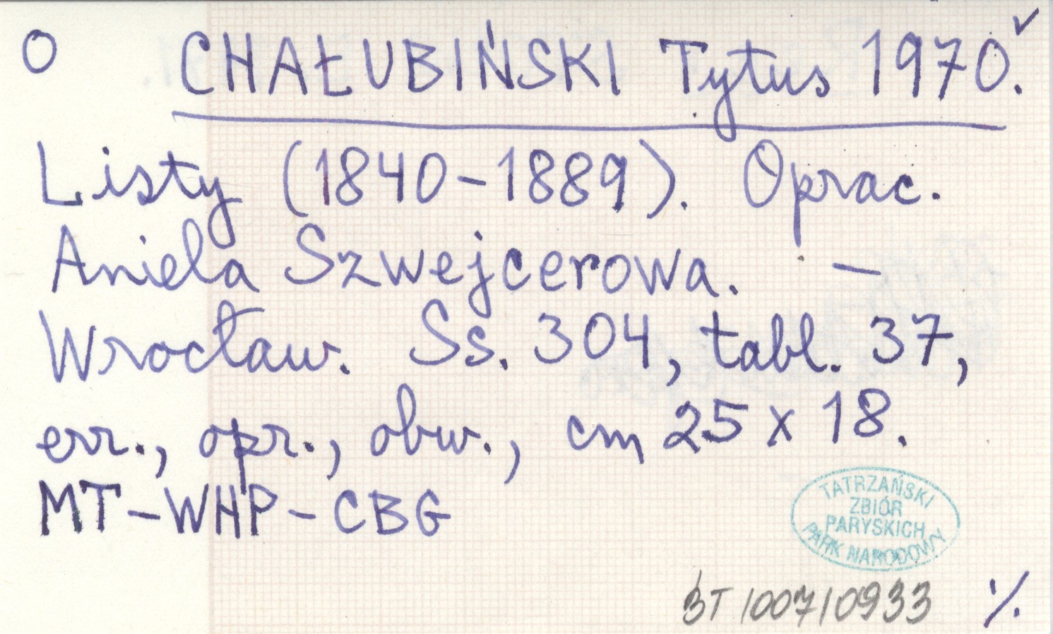 CHAŁUBIŃSKI Tytus 1970 Listy (1840-1889). Oprac. Aniela Szwejcerowa.