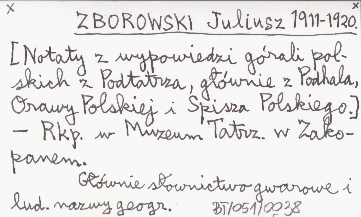 ZBOROWSKI Juliusz 1911-1920 [Notaty z wypowiedzi górali polskich z Podtatrza, głównie z Podhala, Orawy Polskiej i Spisza Polskiego.]