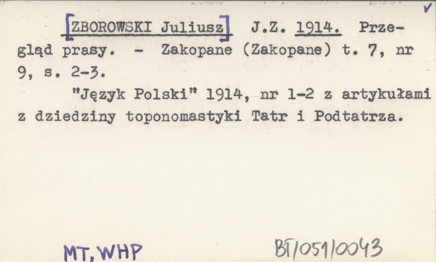 Zakopane (Zakopane) , T. 7, nr 9: 2-3. "Język Polski" 1914, nr 1-2 z artykułami z dziedziny toponomastyki Tatr i Podtatrza.