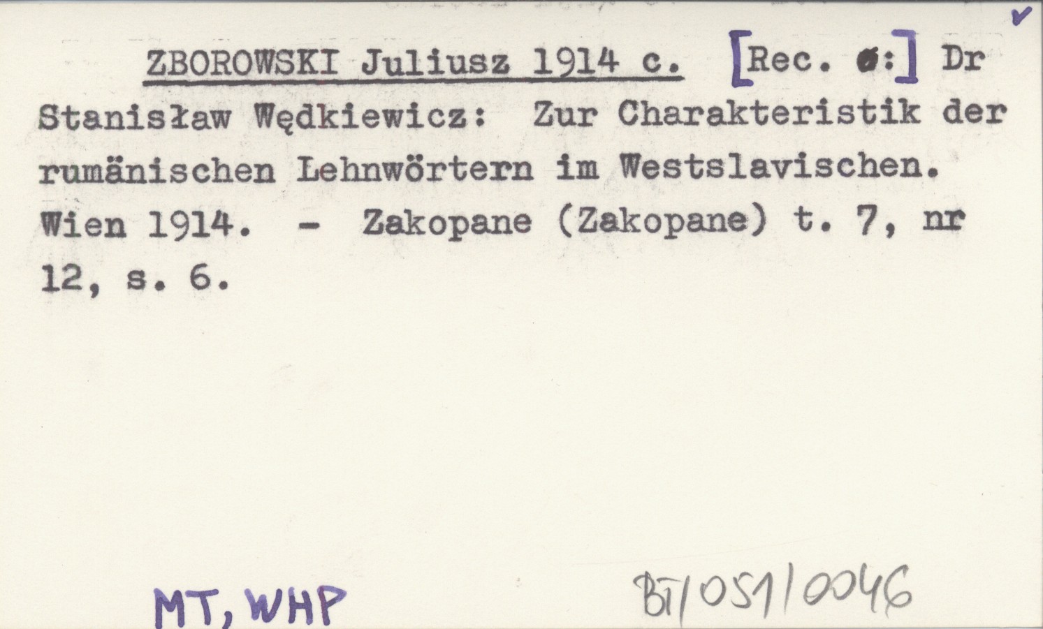 ZBOROWSKI Juliusz 1914 c [Rec. o:] Dr Stanisław Wędkiewicz: Zur Charakteristik der rumänischen Lehnwörtern im Westslavischen. Wien 1914.