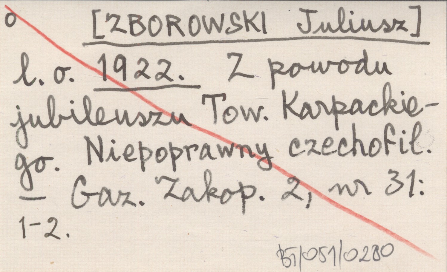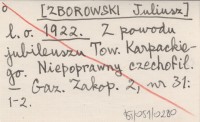 l.o. [ZBOROWSKI Juliusz] 1922 Z powodu jubileuszu Tow. Karpackiego. Niepoprawny czechofil.