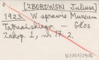 [ZBOROWSKI Juliusz] 1923 W sprawie Muzeum Tatrzańskiego.