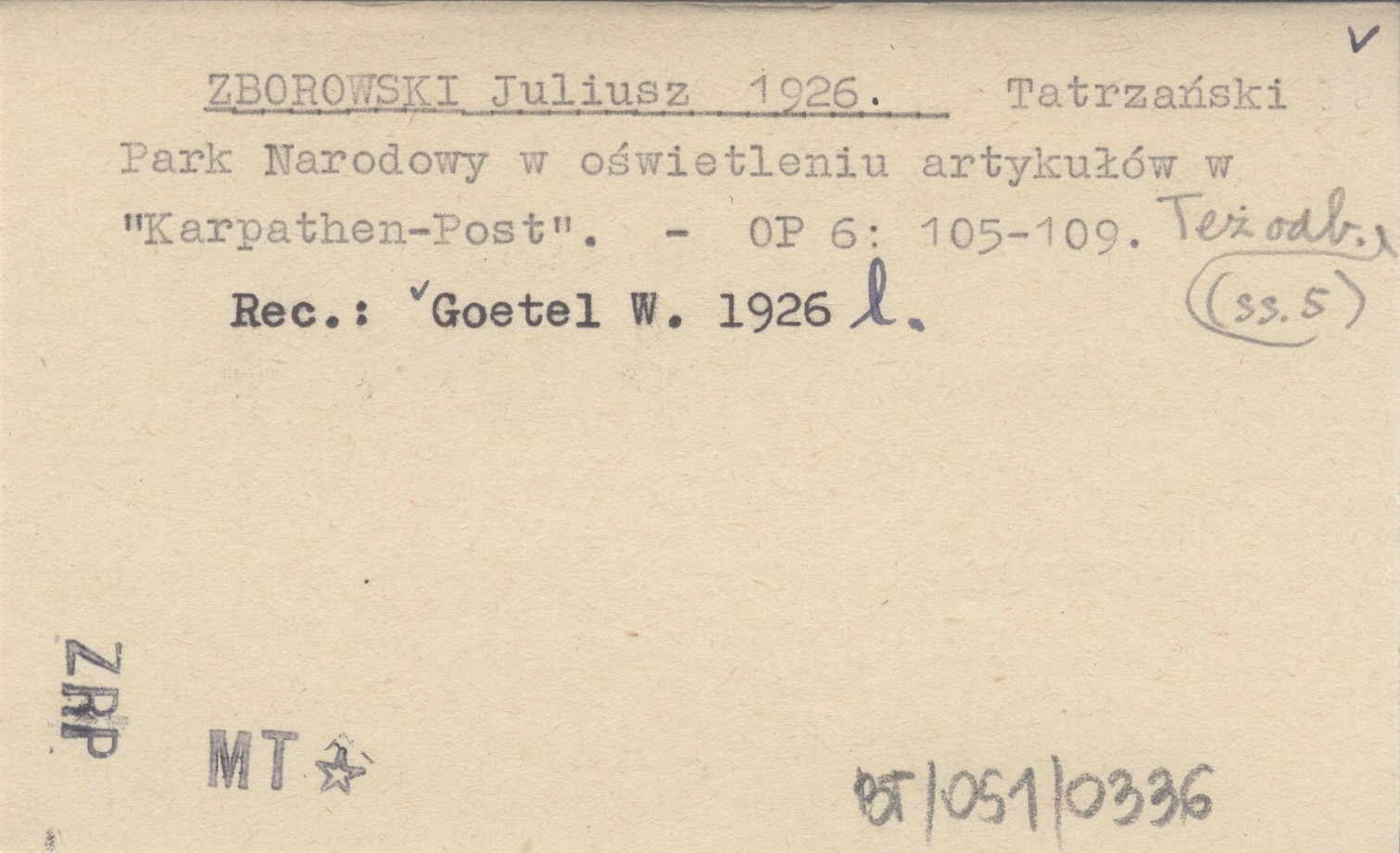 ZBOROWSKI Juliusz 1926 Tatrzański Park Narodowy w oświetleniu artykułów w "Karpathen-Post".