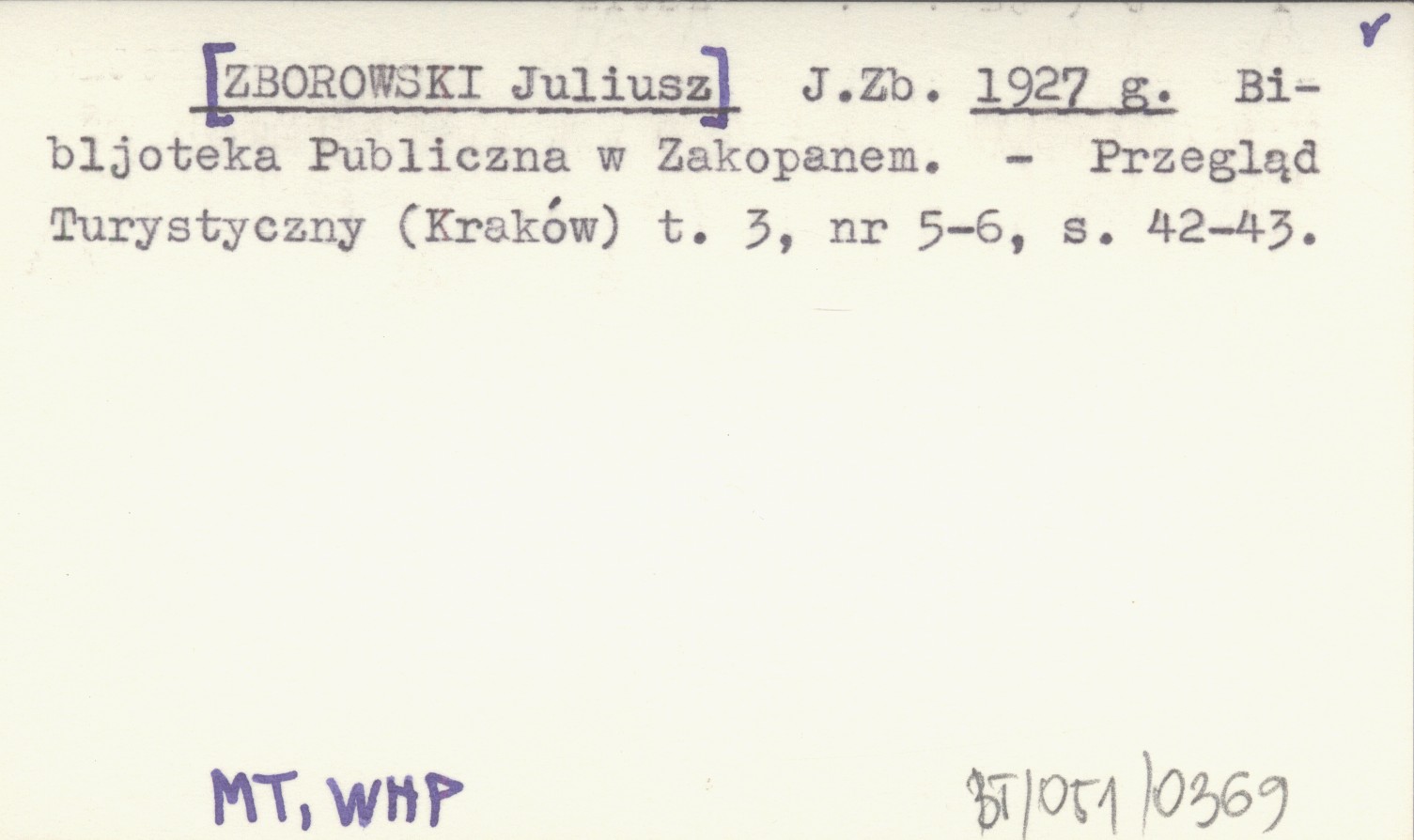 J. Zb. [ZBOROWSKI Juliusz] 1927 g Bibljoteka Publiczna w Zakopanem.