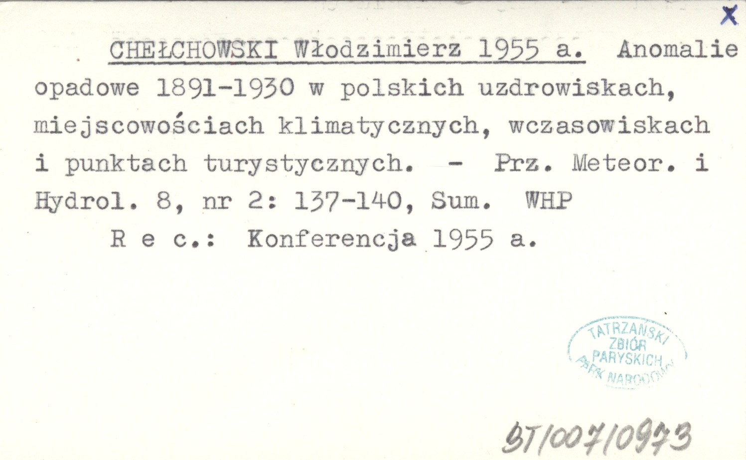 CHEŁCHOWSKI Włodzimierz 1955 a Anomalie opadowe 1891-1930 w polskich uzdrowiskach, miejscowościach klimatycznych, wczasowiskach i punktach turystycznych.