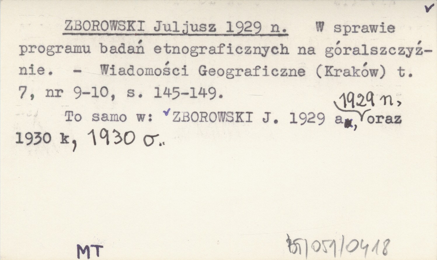 Wiadomości Geograficzne (Kraków) , T. 7, nr 9-10: 145-149. To samo w: ZBOROWSKI J. 1929 a, 1929 n, oraz 1930 k, 1930 o.