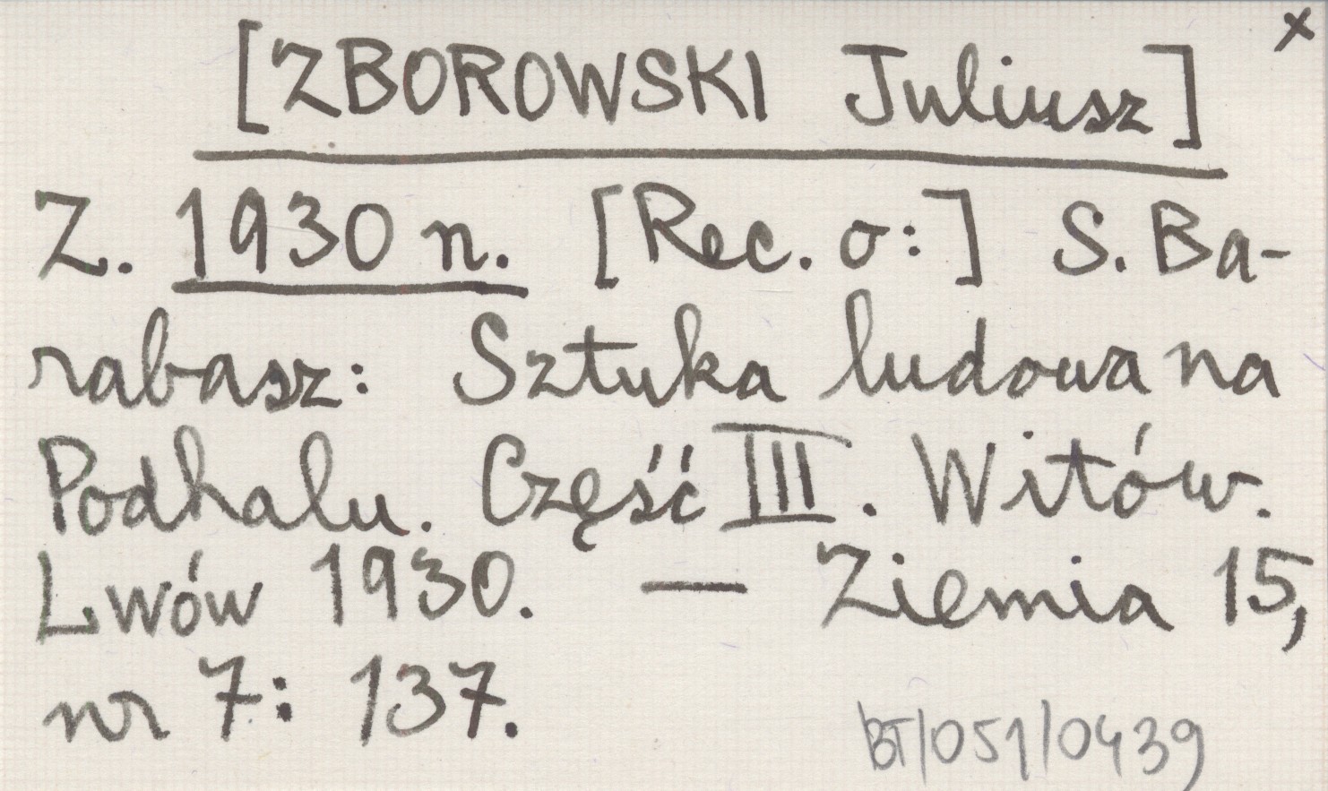 Z. [ZBOROWSKI Juliusz] 1930 n [Rec. o:] S. Barabasz: Sztuka ludowa na Podhalu. Część III. Witów. Lwów 1930.