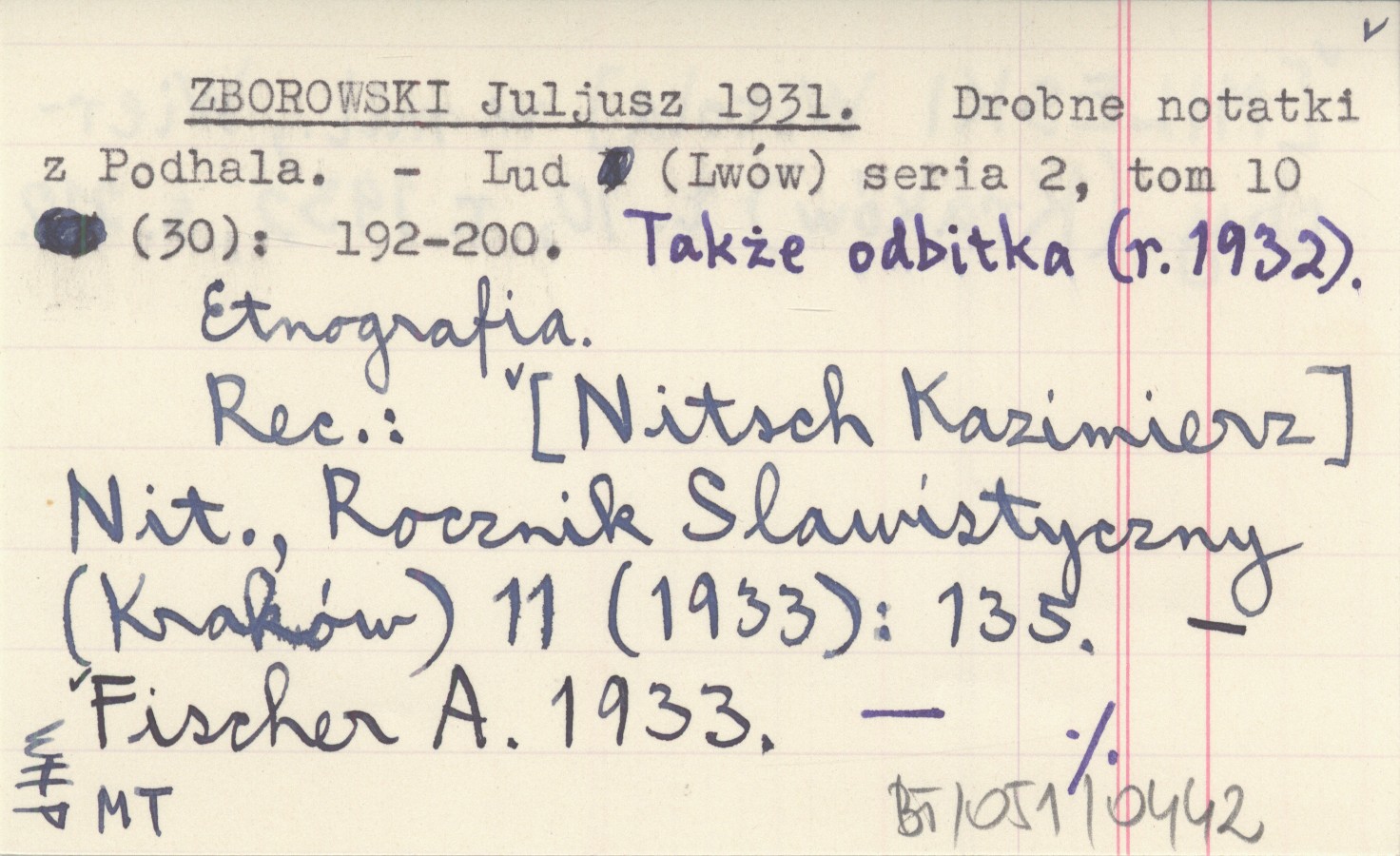 Lud (Lwów) , Ser. 2, t. 10 (30): 192-200. Etnografia. Także odbitka (r. 1932). REC: [NITSCH Kazimierz] Nit., Rocznik Slawistyczny (Kraków) 11 (1933): 135 ; FISCHER A. 1933 ; [MILESKI Witold] w. mil., Wierchy (Kraków) t. 10 (1932): 210 ;