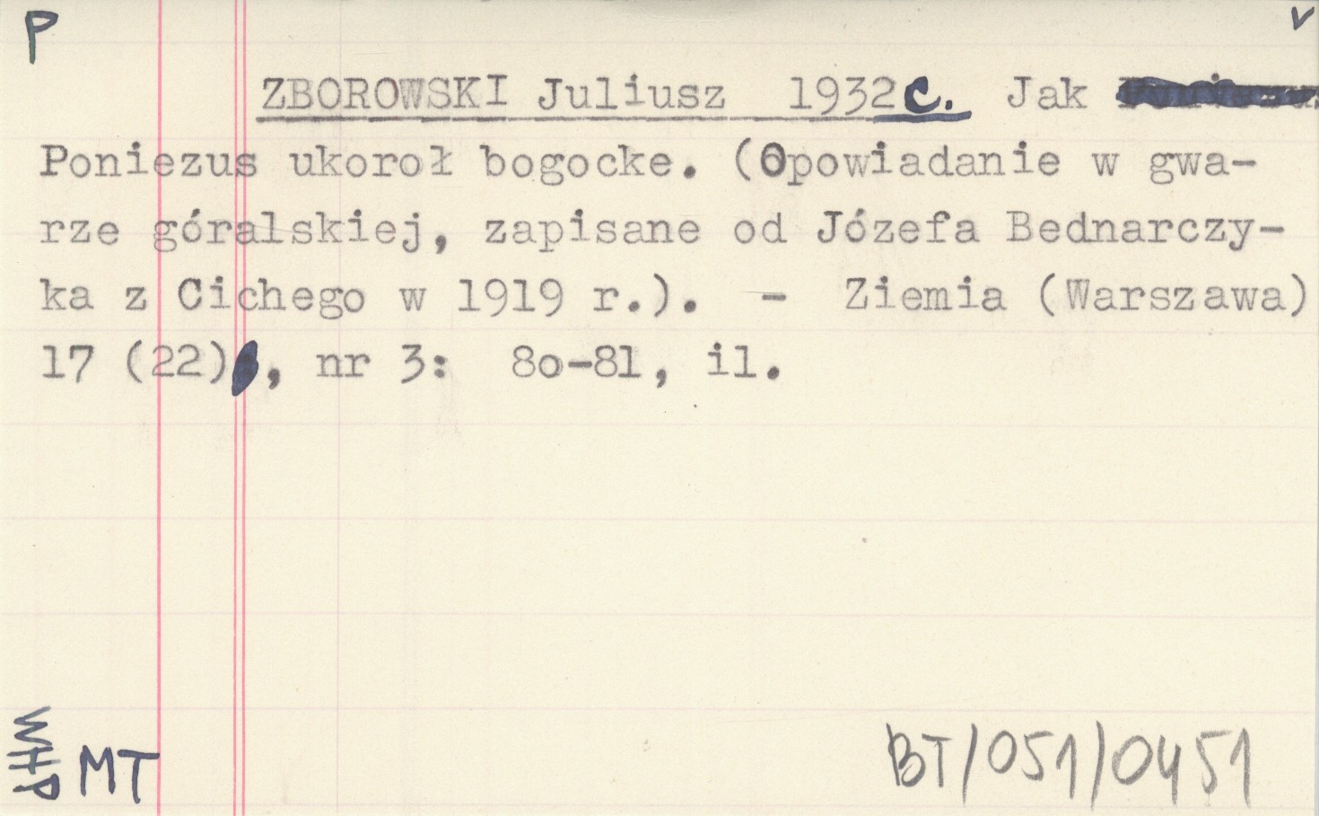 ZBOROWSKI Juliusz 1932 c Jak Poniezus ukoroł bogocke. (Opowiadanie w gwarze góralskiej, zapisane od Józefa Bednarczyka z Cichego w 1919 r.).