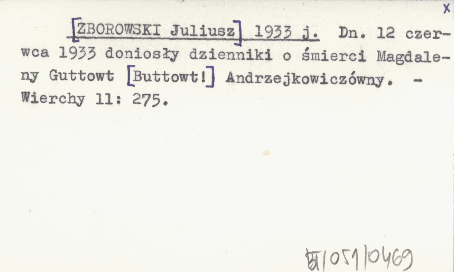 [ZBOROWSKI Juliusz] 1933 j Dn. 12 czerwca 1933 doniosły dziennik o śmierci Magdaleny Guttowt [Buttowt!] Andrzejkowiczówny.