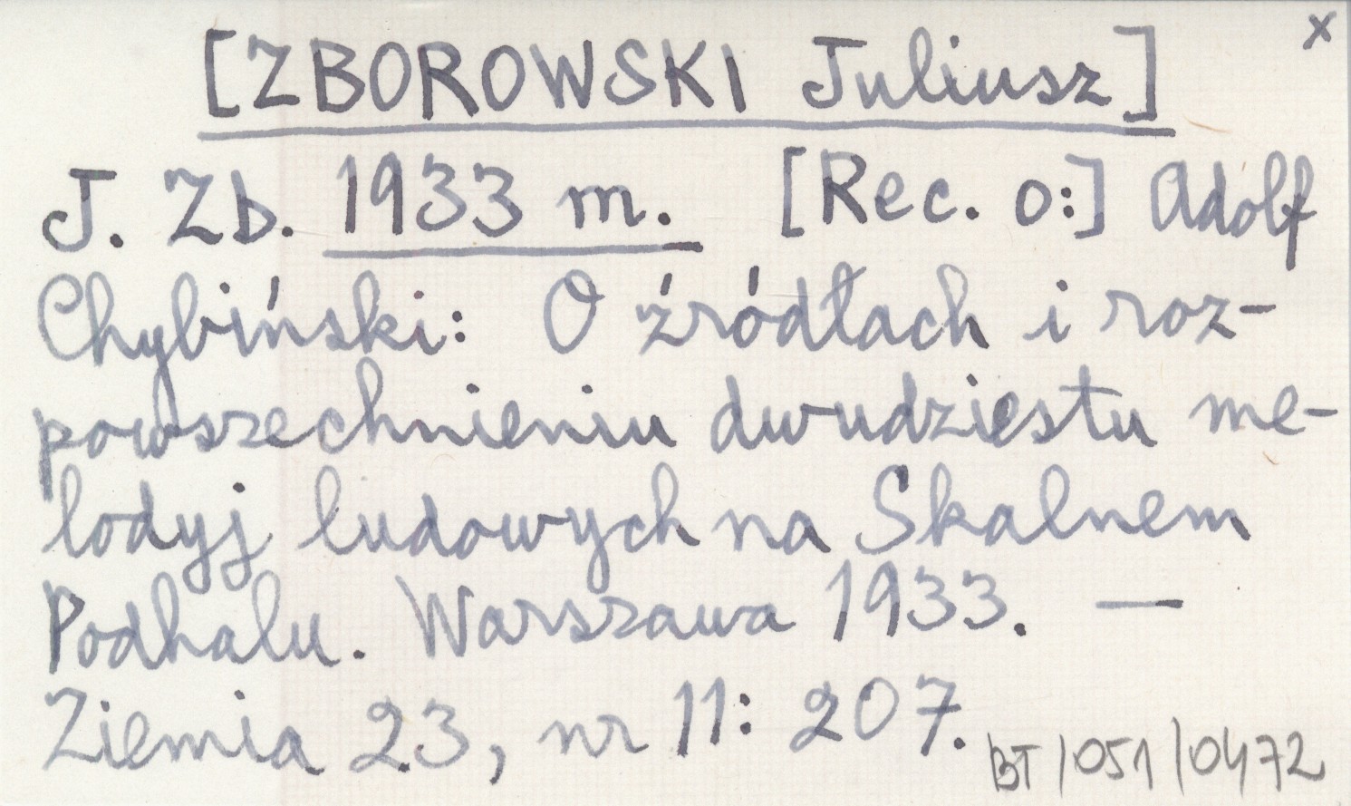 J. Zb. [ZBOROWSKI Juliusz] 1933 m [Rec. o:] Adolf Chybiński: O źródłach i rozpowszechnieniu dwudziestu melodyj ludowych na Skalnem Podhalu. Warszawa 1933.