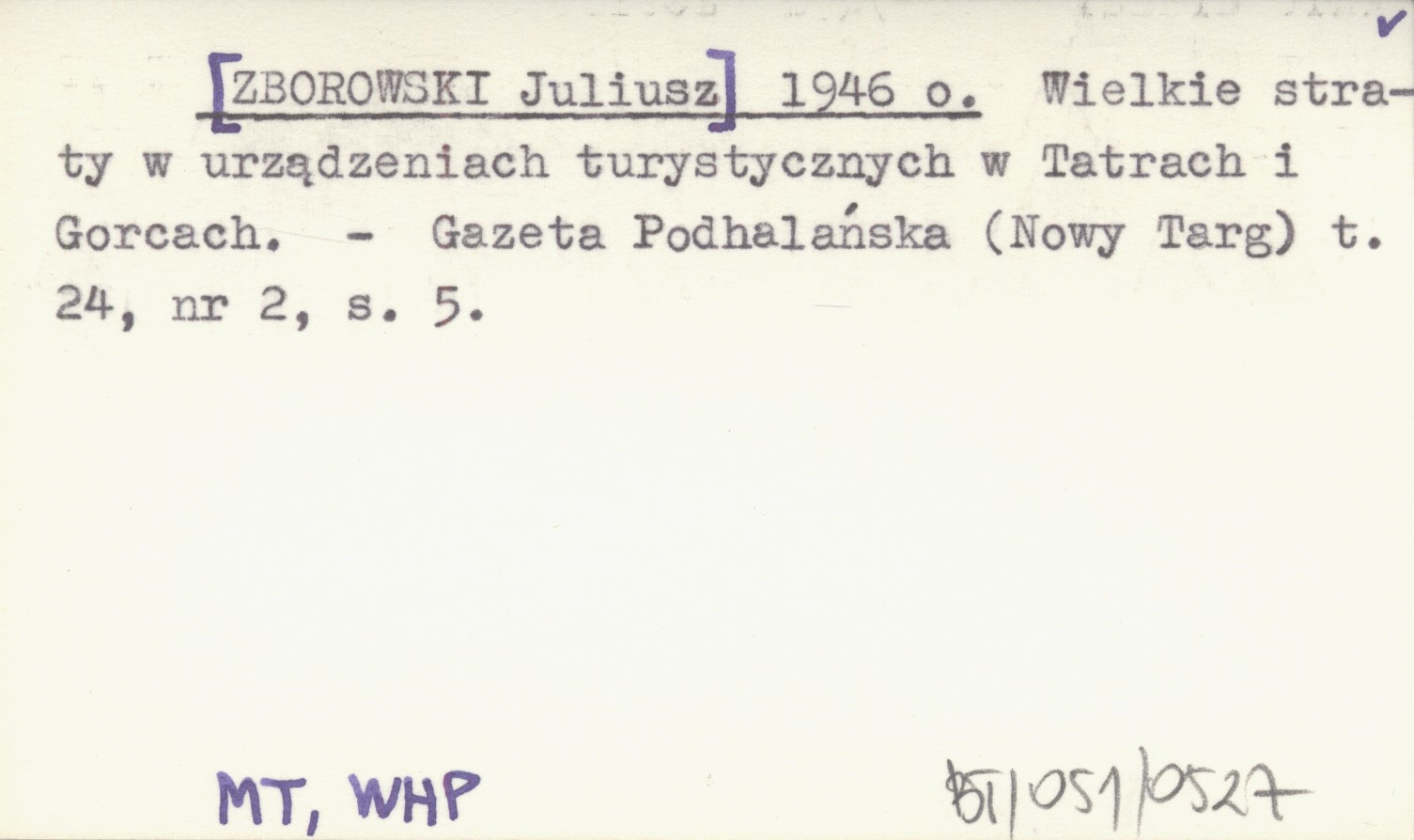 [ZBOROWSKI Juliusz] 1946 o Wielkie straty w urządzeniach turystycznych w Tatrach i Gorcach.