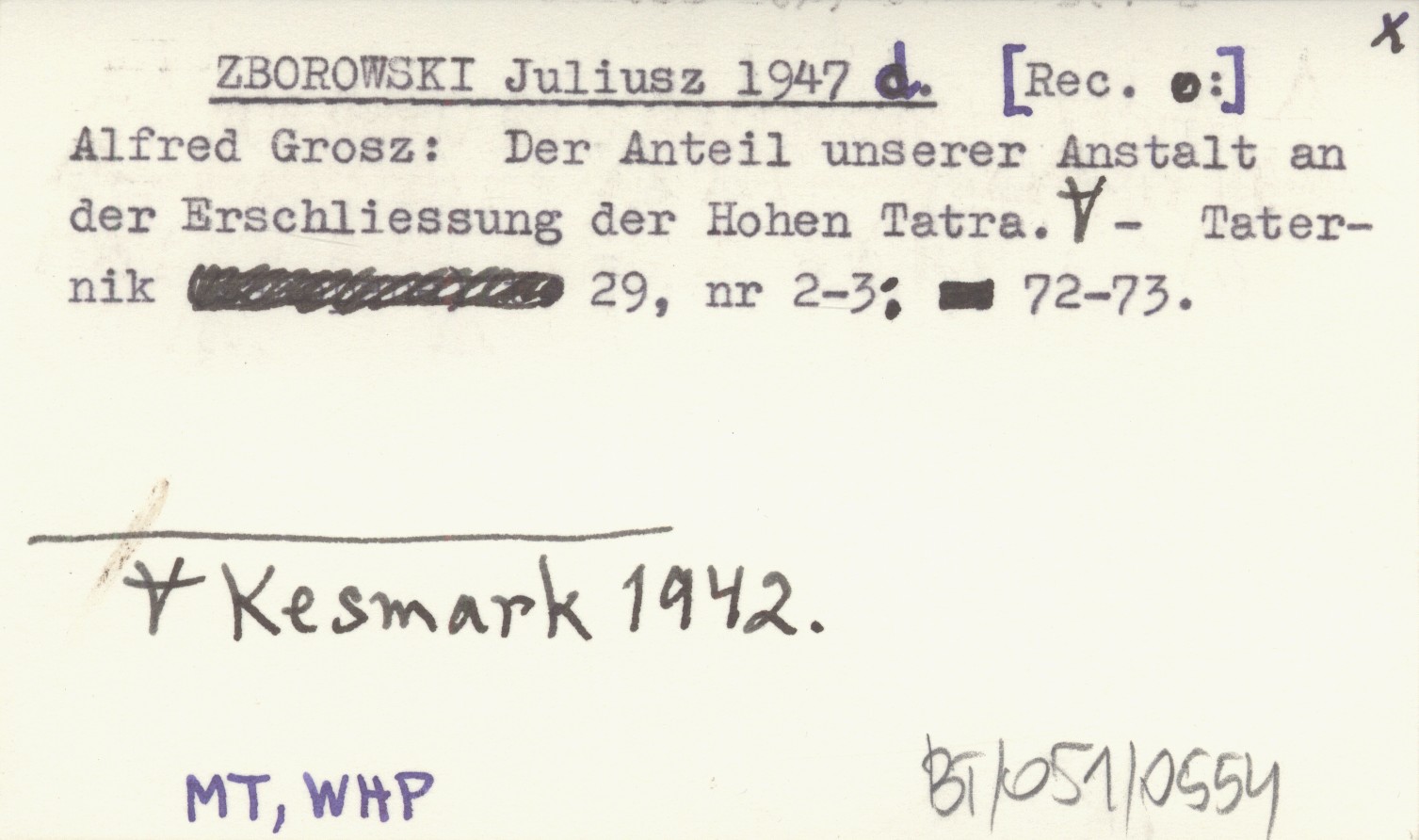 ZBOROWSKI Juliusz 1947 d [Rec. o:] Alfred Grosz: Der Anteil unserer Anstalt an der Erschliessung der Hohen Tatra. Kesmark 1942.