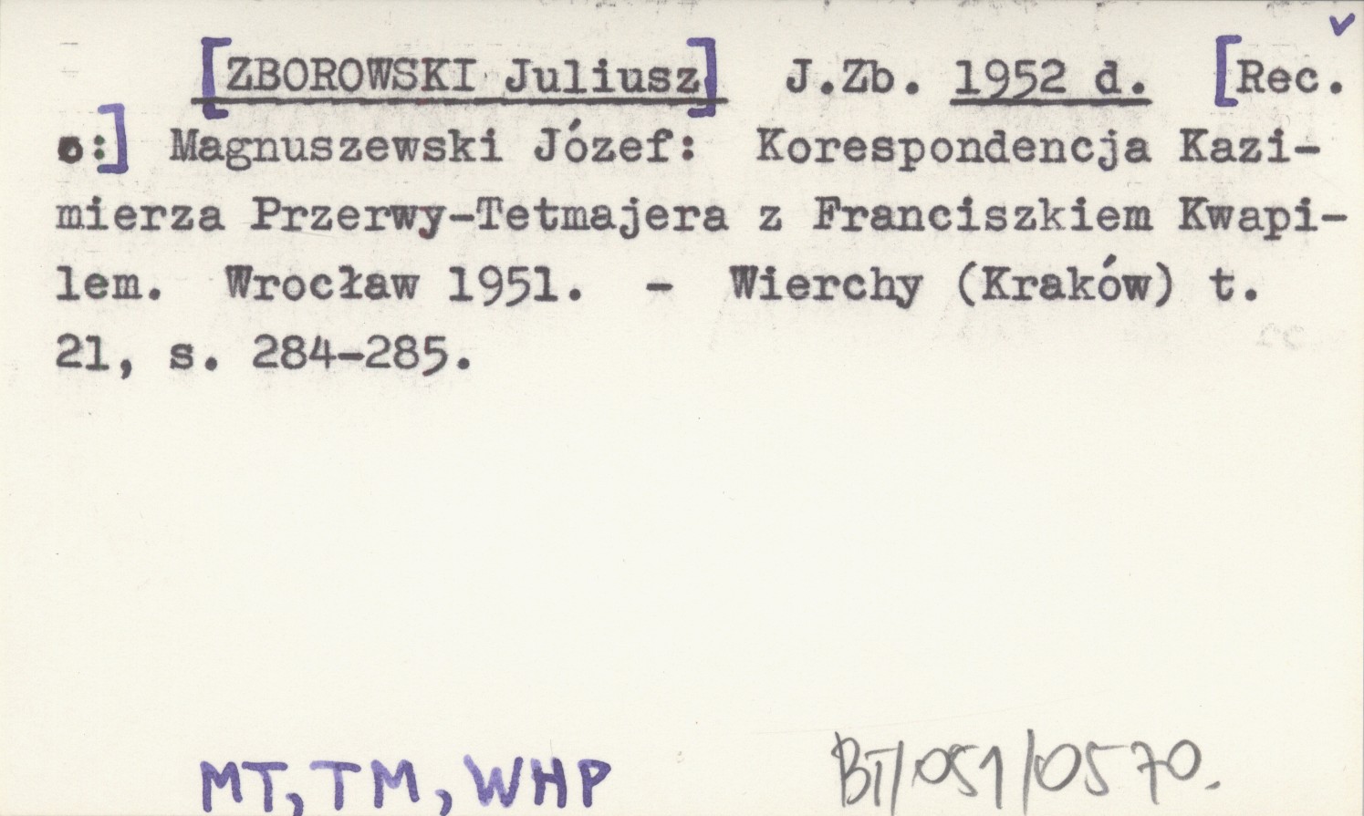J. Zb. [ZBOROWSKI Juliusz] 1952 d [Rec. o:] Magnuszewski Józef: Korespondencja Kazimierza Przerwy-Tetmajera z Franciszkiem Kwapilem. Wrocław 1951.