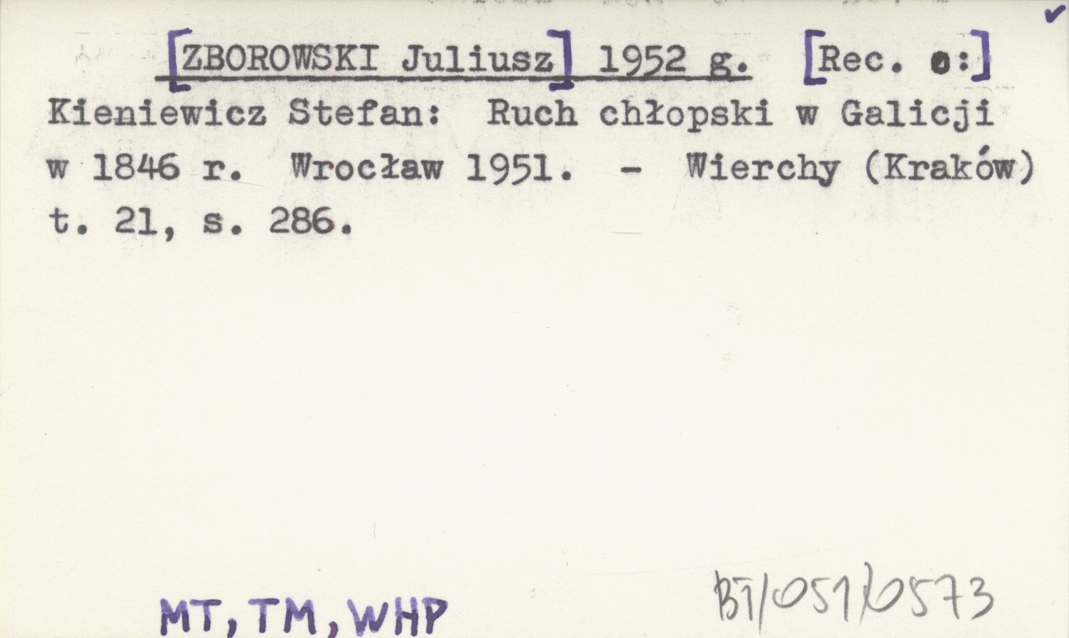 [ZBOROWSKI Juliusz] 1952 g [Rec. o:] Kieniewicz Stefan: Ruch chłopski w Galicji w 1846 r. Wrocław 1951.