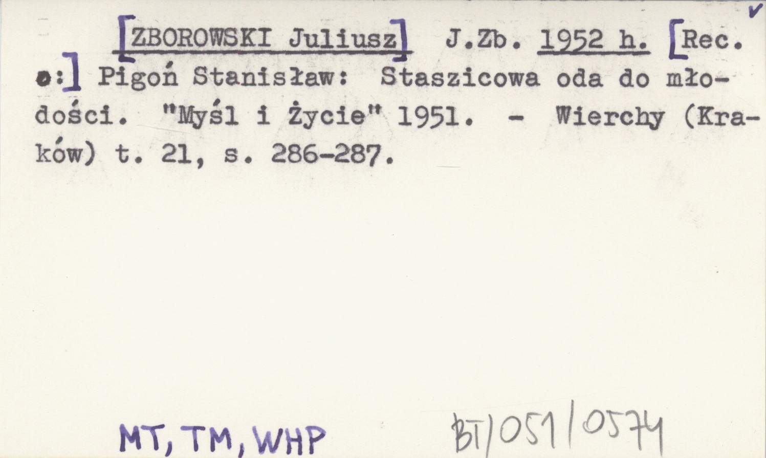 J. Zb. [ZBOROWSKI Juliusz] 1952 h [Rec. o:] Pigoń Stanisław: Staszicowa oda do młodości. "Myśl i Życie" 1951.