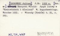 J. Zb. [ZBOROWSKI Juliusz] 1952 e [Rec. o:] Taszycki Witold: Język ludowy w "Krakowiakach i Góralach" W. Bogusławskiego. Wrocław 1951.