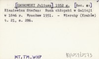 [ZBOROWSKI Juliusz] 1952 g [Rec. o:] Kieniewicz Stefan: Ruch chłopski w Galicji w 1846 r. Wrocław 1951.