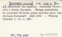 J. Zb. [ZBOROWSKI Juliusz] 1952 i [Rec. o:] Jakubowski Jan Zygmunt: Stanisław Witkiewicz i Stefan Żeromski. "Księga pamiątkowa ku uczczeniu 40-lecia pracy naukowej prof. dra Juliusza Kleinera". Łódź 1949.