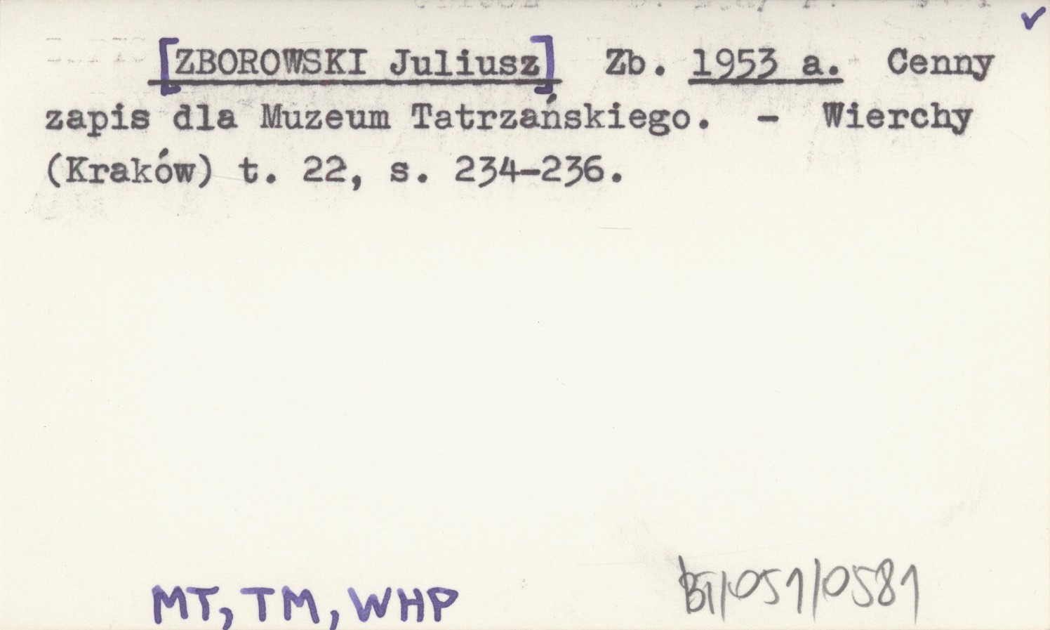Zb. [ZBOROWSKI Juliusz] 1953 a Cenny zapis dla Muzeum Tatrzańskiego.