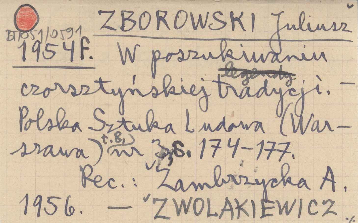 Polska Sztuka Ludowa (Warszawa) , T. 8, nr 3: 174-177. REC: ZAMBRZYCKA A. 1956 ; ZWOLAKIEWICZ Henryk, Lud (Wrocław) t. 43 (1956, druk 1958): 357 ;
