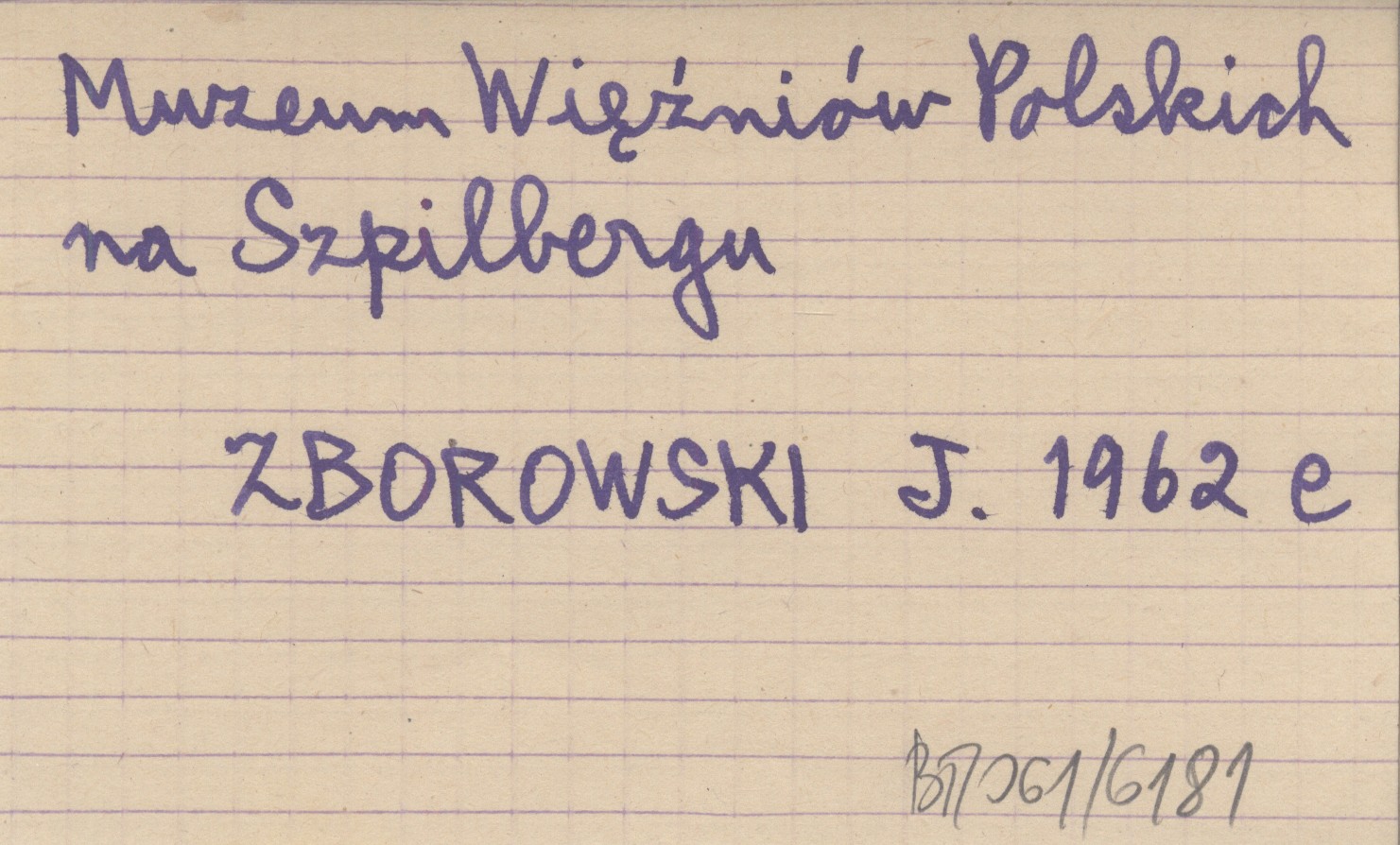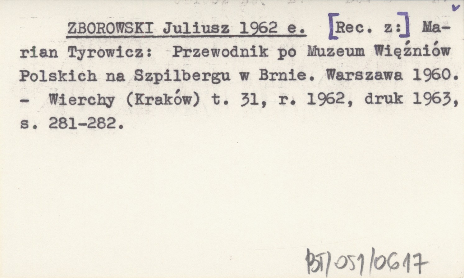 ZBOROWSKI Juliusz 1962 e [Rec. z:] Marian Tyrowicz: Przewodnik po Muzeum Więźniów Polskich na Szpilbergu w Brnie. Warszawa 1960.