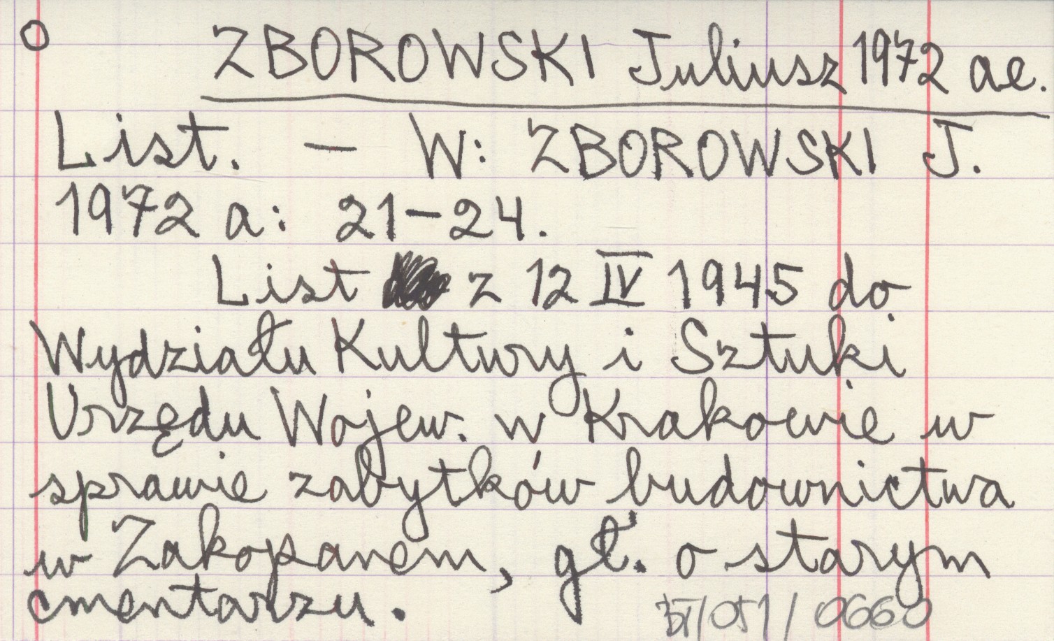 ZBOROWSKI J. 1972 a , S. 21-24. List z 12 IV 1945 do Wydziału Kultury i Sztuki Urzędu Wojewódzkiego w Krakowie w sprawie zabytków budownictwa w Zakopanem, gł. o starym cmentarzu.