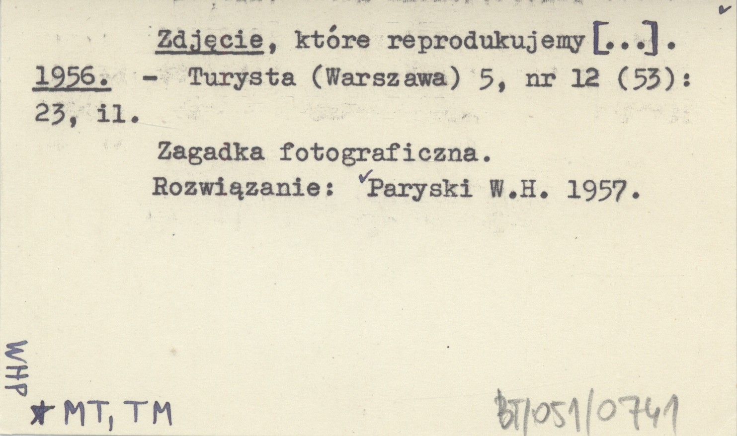 Turysta (Warszawa) , 5, nr 12 (53): 23, il. Zagadka fotograficzna. Rozwiązanie: PARYSKI W. H. 1957.