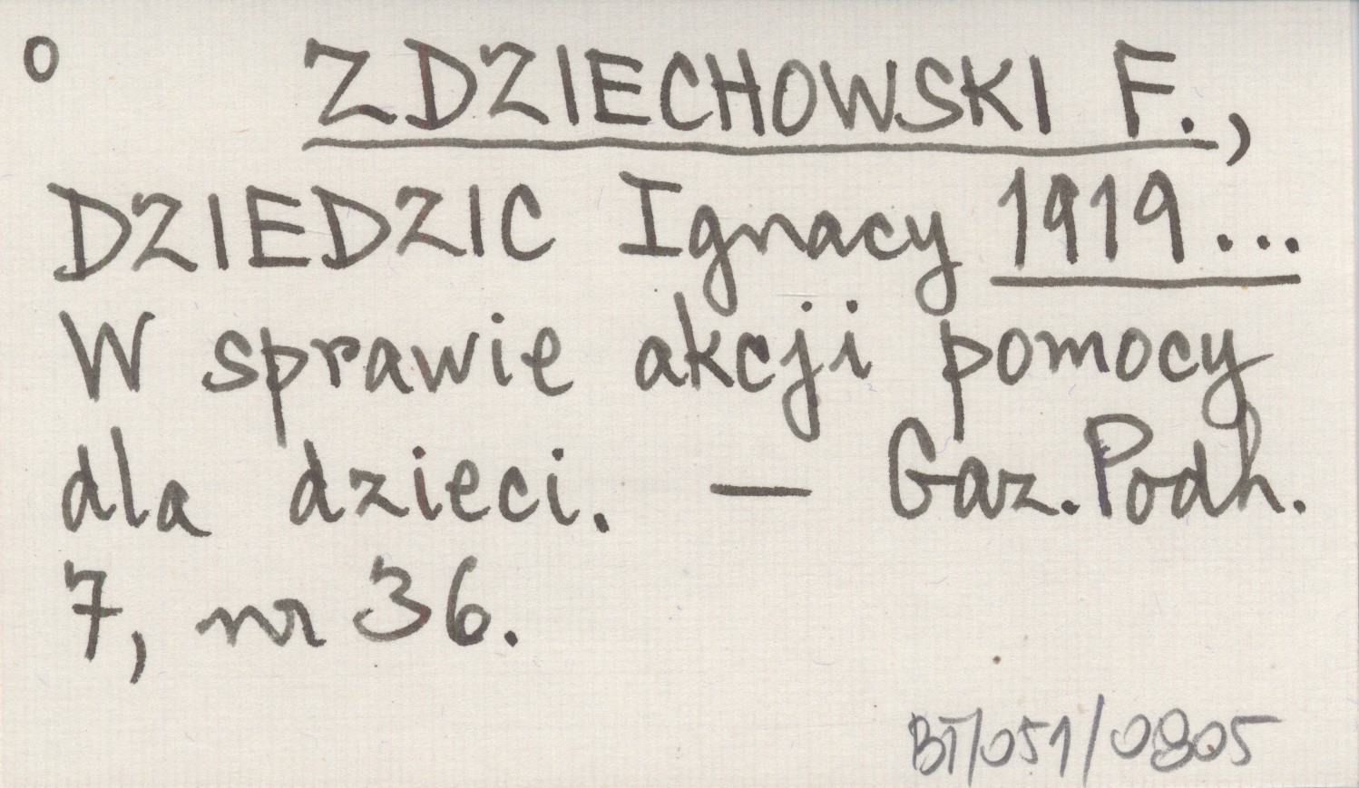 ZDZIECHOWSKI F. DZIEDZIC, Ignacy. ; 1919... W sprawie akcji pomocy dla dzieci.