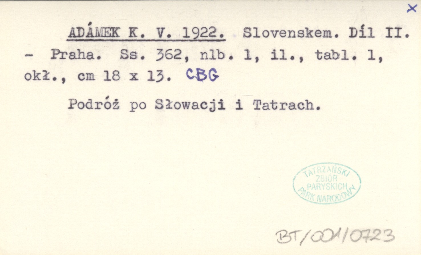 Praha , 362, [1] s., il., 1 k. tabl., okł., 18x13 cm. Podróż po Słowacji i Tatrach.