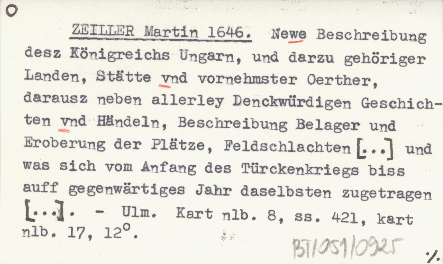ZEILLER Martin 1646 Newe Beschreibung desz Königreichs Ungarn, und darzu gehöriger Landen, Stätte vnd vornehmster Oerther, darausz neben allerley Denckwürdigen Geschichten vnd Händeln, Beschreibung Belager und Eroberung der Plätze, Feldschlachten [...] und was sich vom Anflag des Türckenkriegs biss auff gegenwärtiges Jahr daselbsten zugetragen [...].