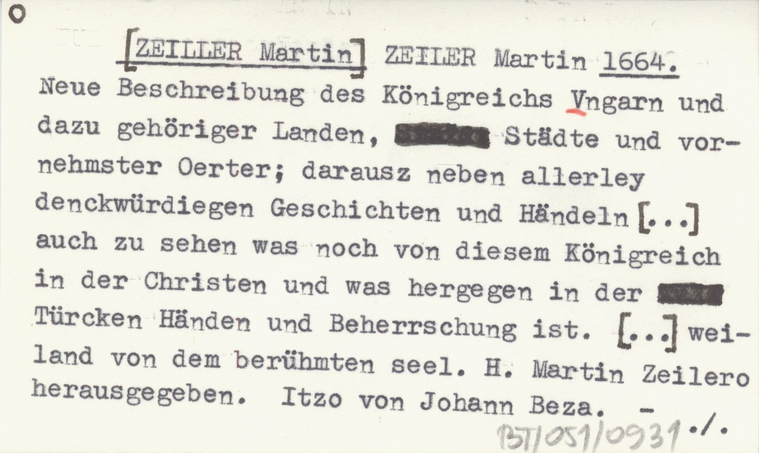 ZEILER Martin [ZEILLER Martin] 1664 Neue Beschreibung des Königreichs Vngarn und dazu gehöriger Landen, Städte und vornehmster Oerter, darausz neben allerley denckwürdiegen Geschichten und Händeln [...] auch zu sehen was noch von diesem Königreich in der Christen und Beherrschung ist. [...] weiland von dem berühmten seel. H. Martin Zeilero herausgegeben. Itzo von Johann Beza.