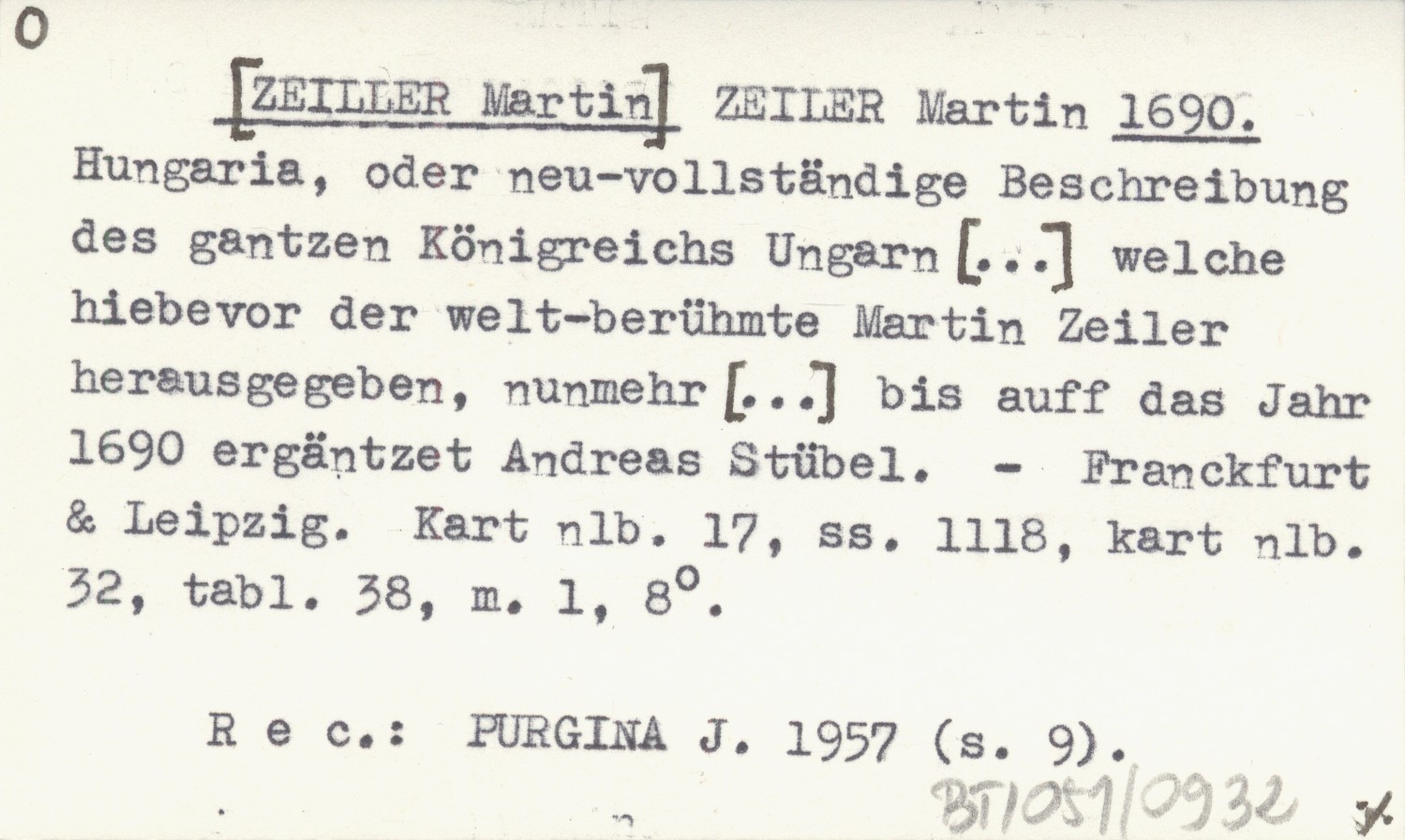 ZEILER Martin [ZEILLER Martin] 1690 Hungaria, oder neu-vollständige Beschreibung des gantzen Königreichs Ungarn [...] welche hiebevor der welt-berühmte Martin Zeiler herausgegeben, nunmehr [...] bis auff das Jahr 1690 ergäntzet Andreas Stübel.