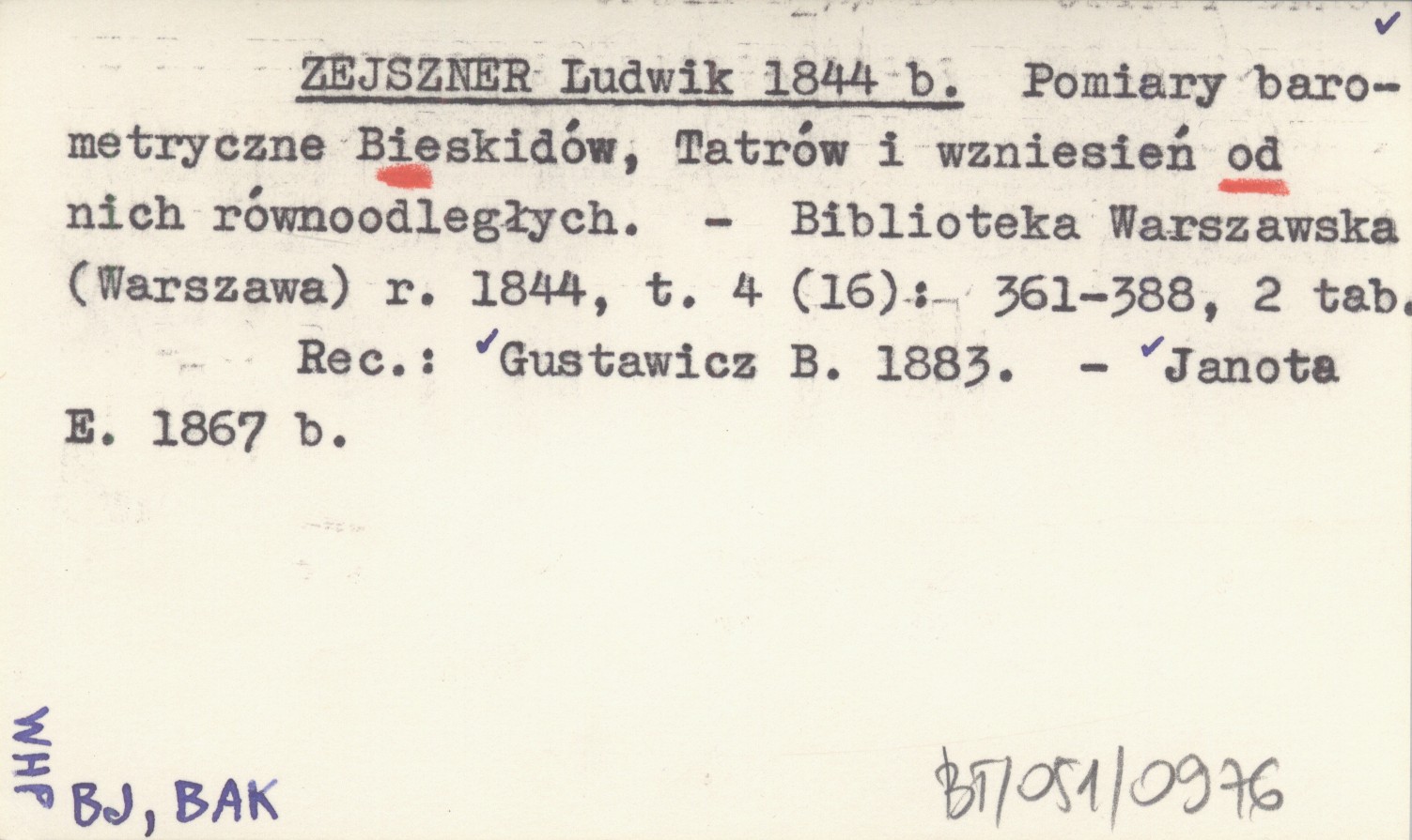 ZEJSZNER Ludwik 1844 b Pomiary barometryczne Bieskidów, Tatrów i wzniesień od nich równoodległych.