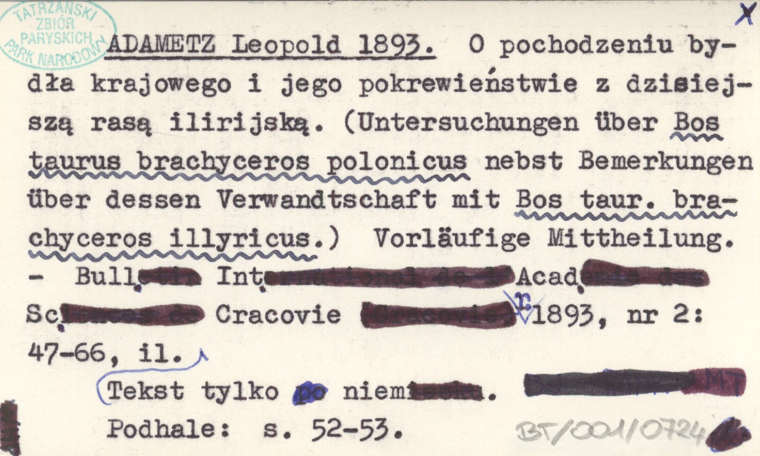 ADAMETZ Leopold 1893 O pochodzeniu bydła krajowego i jego pokrewieństwie z dzisiejszą rasą ilirijską. (Untersuchungen über Bos taurus brachyceros polonicus nebst Bemerkungen über dessen Verwandtschaft mit Bos taur. brachyceros illyricus.) Vorläufige Mittheilung.