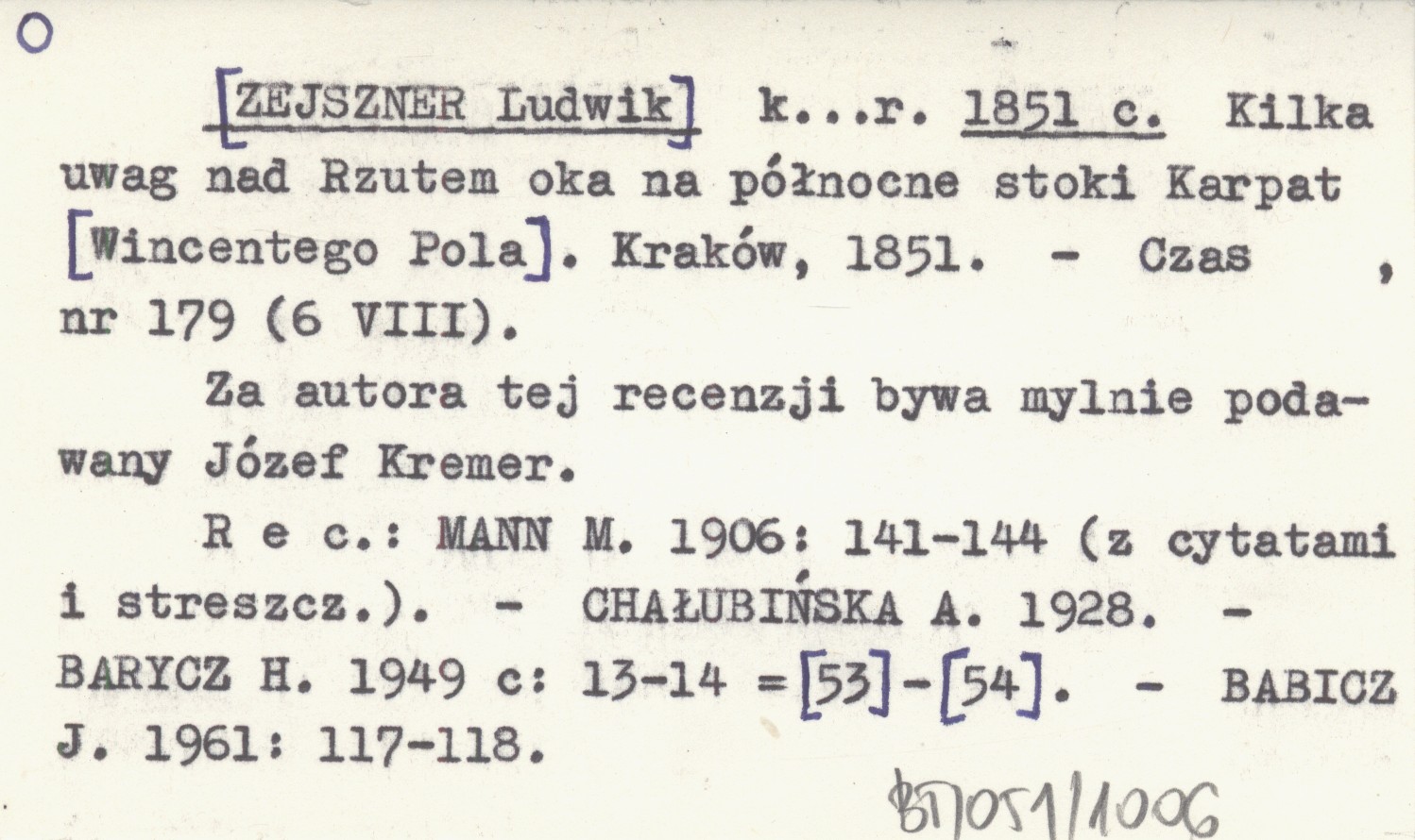 k...r. [ZEJSZNER Ludwik] 1851 c Kilka uwag nad Rzutem oka na północne stoki Karpat [Wincentego Pola]. Kraków, 1851.