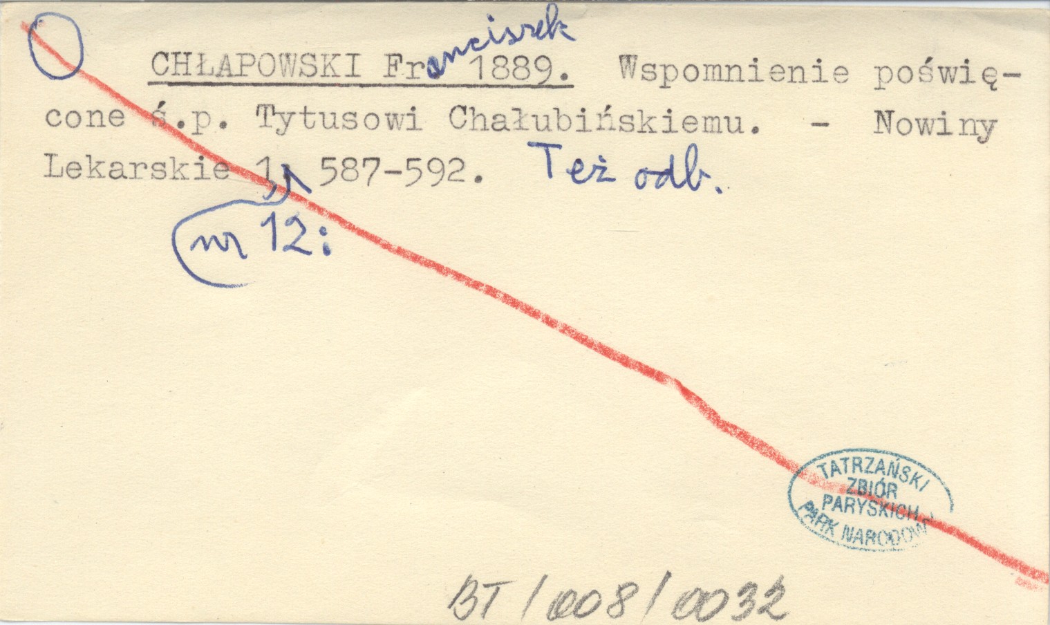 CHŁAPOWSKI Franciszek 1889 Wspomnienie poświęcone ś. p. Tytusowi Chałubińskiemu.