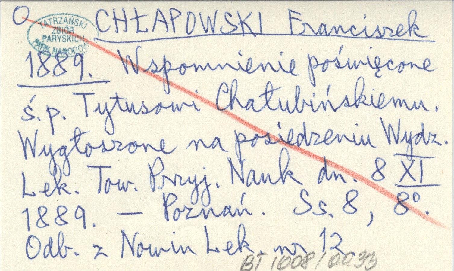CHŁAPOWSKI Franciszek 1889 Wspomnienie poświęcone ś. p. Tytusowi Chałubińskiemu. Wygłoszone na posiedzeniu Wydziału Lekarskiego Towarzystwa Przyjaciół Nauk dn. 8 XI 1889.