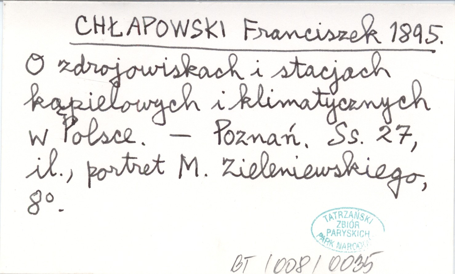 CHŁAPOWSKI Franciszek 1895 O zdrojowiskach i stacjach kąpielowych i klimatycznych w Polsce.