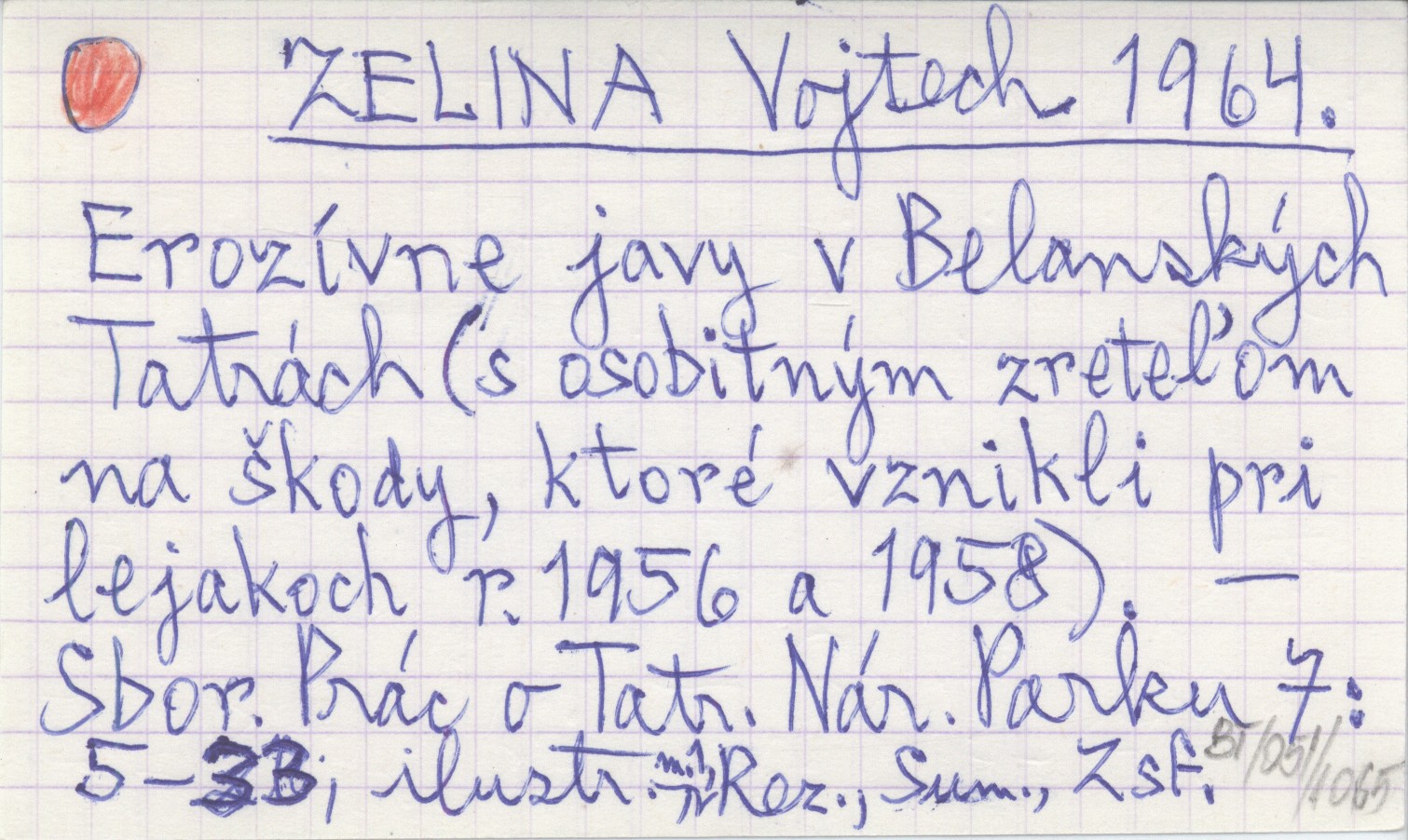 ZELINA Vojtech 1964 Erozívne javy v Belanskęch Tatrách (s osobitnęm zrete”om na čkody, ktoré vznikli pri lejakoch r. 1956 a 1958).