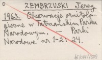 ZEMBRZUSKI Jerzy 1963 Obserwacje ornitologiczne w Tatrzańskim Parku Narodowym.
