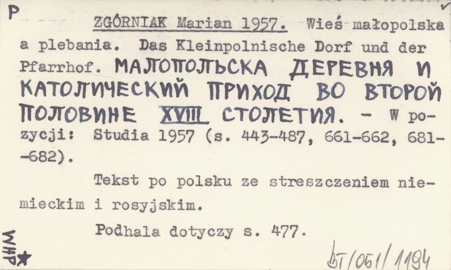 ZGÓRNIAK Marian 1957 Wieś małopolska a plebania. Das Kleinpolnische Dorf und der Pfarrhof. Malopol'ska derevnja i katoličeskij prichod vo vtoroj polovine XVIII stoletija.