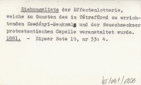 Ziehungsliste der Effectenlotterie, welche zu Gunsten des in Tátrafüred zu errichtenden Zsedényi-Denkmals und der Neuschmeckser protestantischen Capelle veranstaltet wurde. 1881