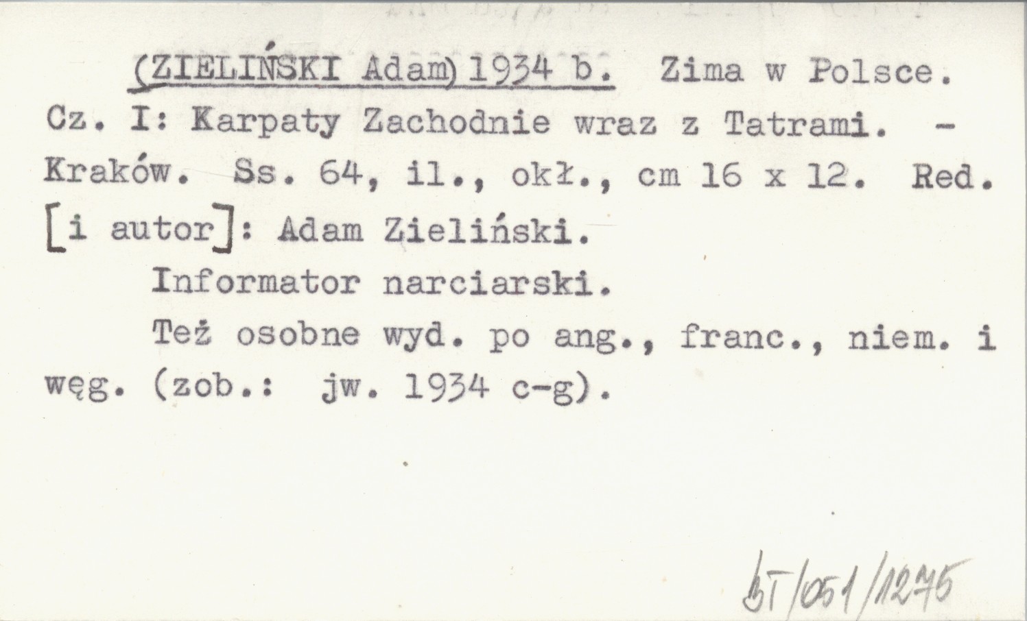 [ZIELIŃSKI Adam] RED: ZIELIŃSKI, Adam. ; 1934 b Zima w Polsce. Cz. I: Karpaty Zachodnie wraz z Tatrami.