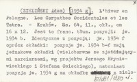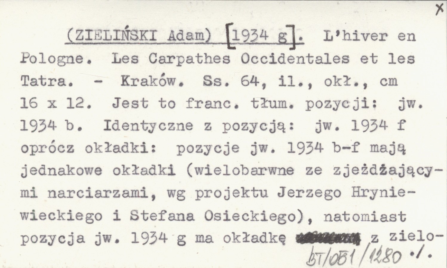 Kraków , 64 s., il., okł., 16x12 cm. Jest to francuskie tłumaczenie pozycji: jw. 1934 b. Identyczne z pozycją: jw. 1934 f oprócz okładki: pozycje jw. 1934 b-f mają jednakowe okładki (wielobarwne ze zjeżdżającymi narciarzami, wg projektu Jerzego Hryniewieckiego i Stefana Osieckiego), natomiast pozycja jw. 1934 g ma okładkę z zielonym rysunkiem dwóch szczytów bez narciarzy.