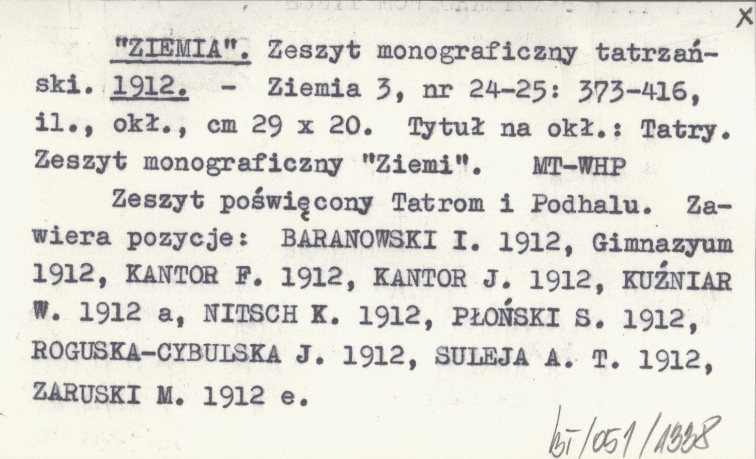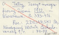 Ziemia, 3, nr 24-25: 373-416, il., okł., 29x20 cm. Zeszyt monograficzny tatrzański. Zeszyt poświęcony Tatrom i Podhalu. Zawiera pozycje: BARANOWSKI I. 1912, Gimnazyum 1912, KANTOR F. 1912, KANTOR J. 1912, KUŹNIAR W. 1912 a, NITSCH K. 1912, PŁOŃSKI S. 1912, ROGUSKA-CYBULSKA J. 1912, SULEJA A. T. 1912, ZARUSKI M. 1912 e. Tytuł na okładce: Tatry. Zeszyt monograficzny "Ziemi". REC: ZDZIARSKI St., Národopisný Věstník Československý 9: 74-77.