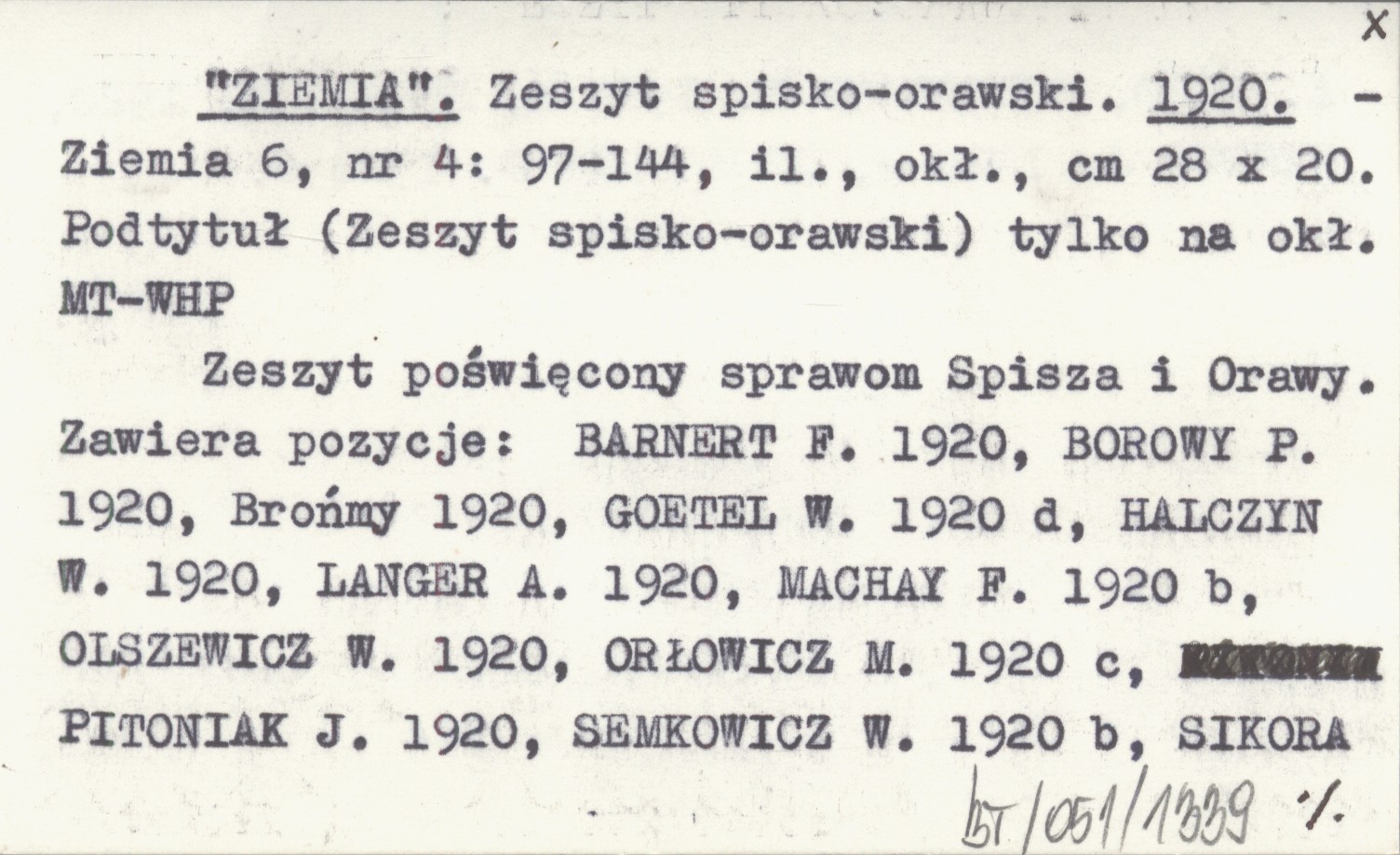 Ziemia, 6, nr 4: 97-144, il., okł., 28x20 cm. Zeszyt poświęcony sprawom Spisza i Orawy. Zawiera pozycje: BARNERT F. 1920, BOROWY P. 1920, Brońmy 1920, GOETEL W. 1920 d, HALCZYN W. 1920, LANGER A. 1920, MACHAY F. 1920 b, OLSZEWICZ W. 1920, ORŁOWICZ M. 1920 c, PITONIAK J. 1920, SEMKOWICZ W. 1920 b, SIKORA A. 1920, SOSNOWSKI K. 1920 a, ŚWIERZ M. 1920, WIKTOR J. 1920 a, ZBOROWSKI J. 1920 e. Podtytuł (Zeszyt spisko-orawski) tylko na okładce.