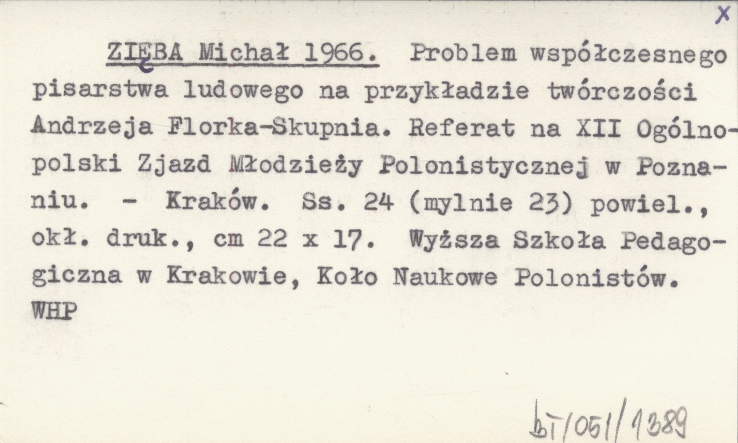 ZIĘBA Michał 1966 Problem współczesnego pisarstwa ludowego na przykładzie twórczości Andrzeja Florka-Skupnia. Referat na XII Ogólnopolski Zjazd Młodzieży Polonistycznej w Poznaniu.